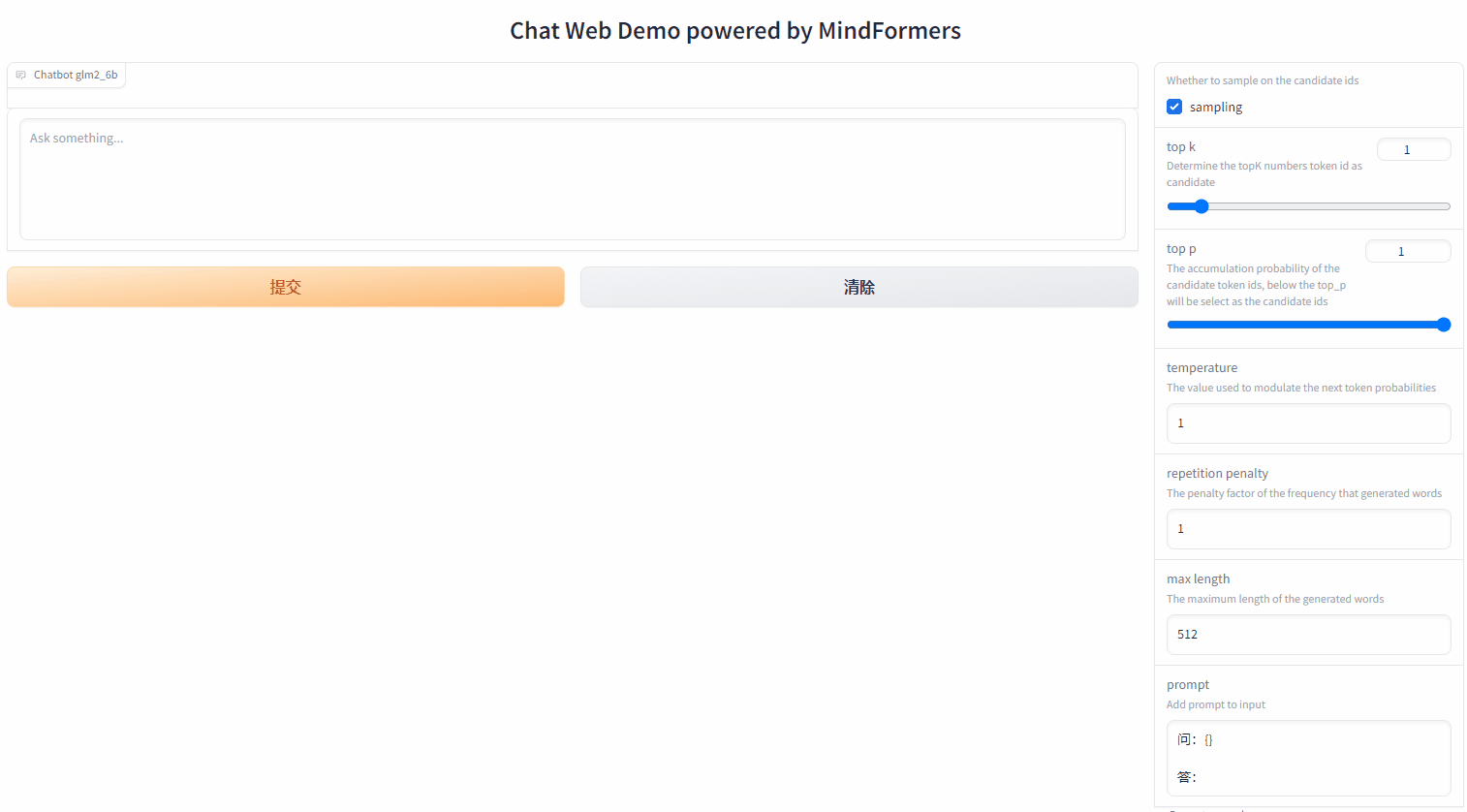 MindSpore Transformers还提供了便捷的在线LLM大模型聊天界面,用户可参考官方教程体验业界SOTA大模型聊天能力,支持多种参数调节、多种Prompt模版定义、流式推理展示等。