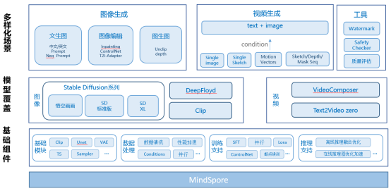 MindSpore One是基于昇思MindSpore的高质量生成式领域系列算法模型库,提供了简单易用的模块接口,内置了悟空画画/SD1.5/SD2.0/SDXL/VideoComposer等最新的图像视频生成模型,高效支持用户训推一体化部署,具有简单易用、高效微调、性能领先等特性。