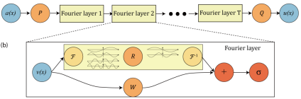 PINNs等物理感知模型主要求解特定方程,神经算子模型则能够学习无限维函数空间的映射,一次求解整个PDEs族。较为典型的有FNO(如下述所示)、DeepONet以及PDENet等。FNO主要利用傅里叶变换的性质,在傅里叶空间中学习函数之间的映射,然后再将结果转回至物理空间。DeepONet通过“branch net”和“trunk net”两个子网络学习函数之间的映射。神经算子模型在流体、气象、电磁等领域有较好的表现,MindSpore SciAI因此也内置了SOTA神经算子模型。