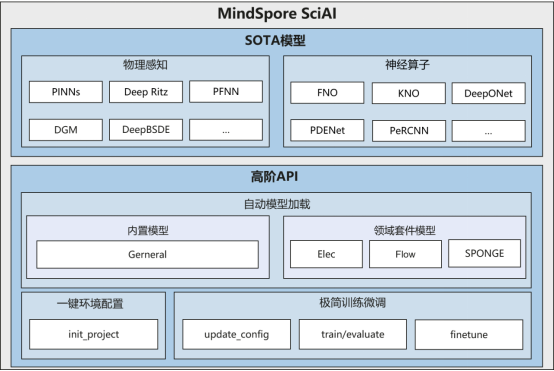MindSpore SciAI是基于昇思MindSpore打造的AI4Science(科学智能)高频模型套件,内置了60+高频SOTA模型,覆盖物理感知(如PINNs、DeepRitz以及PFNN)和神经算子(如FNO、DeepONet、PDENet)等主流模型,覆盖度全球第一;提供了高阶API(一键环境配置、自动模型加载、极简训练微调等),开发者和用户开箱即用。 MindSpore SciAI为广大开发者和用户提供了高效、易用的AI4Science通用计算平台。MindSpore SciAI架构图如下: