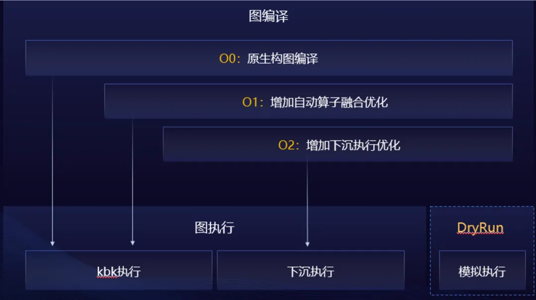 整图下沉执行性能最优,但大模型的规模和参数量发展得更为庞大,整图下沉执行方式在整图编译过程中耗时较长,一个千亿级别的大模型的编译时间为30分钟-60分钟,调试调优效率低下。为解决上述问题,昇思MindSpore2.3.RC1版本中,提供了多级编译技术,O0原生构图不优化、O1增加自动算子融合优化、O2整图下沉执行优化。