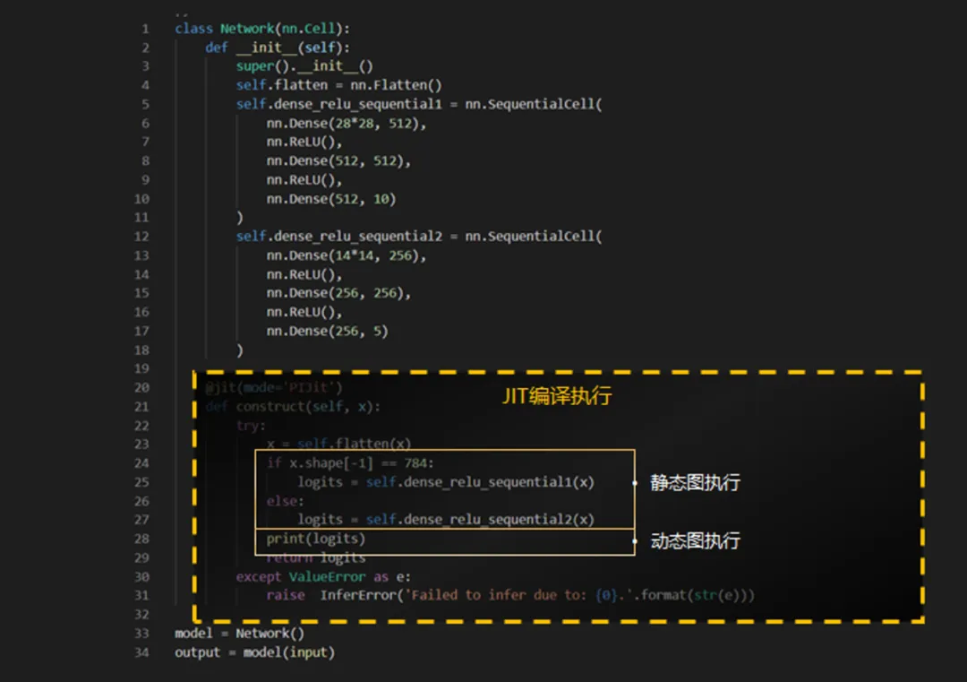 昇思MindSpore支持图模式(静态图)和PyNative模式(动态图)两种运行方法。动态图易于调试,开发灵活,易用性好;静态图语法支持有限,但执行性能好。JIT兼顾性能和易用性,通过对Python字节码进行分析&调整、执行流进行图捕获&图优化,支持入图的Python代码做静态图方式执行,不支持的进行子图切分以动态图方式执行,自动地做到动静统一,实现方法如下图所示。