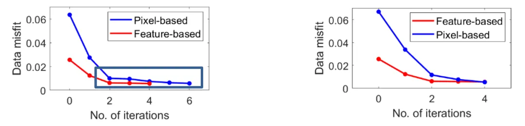 图2 大地电磁反演收敛速度对比(Pixel-based:传统反演;Feature-based:我们的工作)