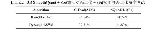 一些对精度十分敏感的模型和任务,即使通过SmoothQuant等异常值抑制技术仍然难以满足精度要求,此时可以通过牺牲一些8bit量化的性能收益,通过动态量化来进一步降低量化的精度损失。