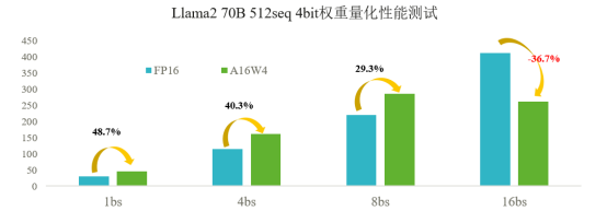 针对Llama2 70B网络,如下图所示,4bit权重量化在batch_size小于8的情况下最多可以获得48.7%的时延收益;但当batch_size大于等于16时,受限于昇腾硬件架构,4ibt权重量化在时延上会产生负收益。