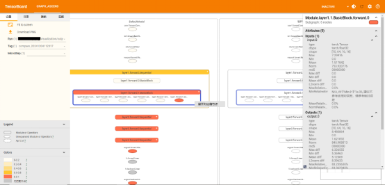 针对大模型场景精度问题定位效率低,精度数据呈现不直观的问题,msprobe工具新增支持昇思MindSpore场景分级可视化构图比对,实现模型各个层级的精度数据比对,方便用户理解模型结构,快速分析精度问题。如下图所示,用户可以选择单图构建查看模型结构,也可以选择双图比对,实现昇思MindSpore与PyTorch的跨框架比对。可视化构图比对展示了模型的层级结构,并且每个节点都展示了输入输出数据信息、堆栈信息等,支持按节点名称搜索和按节点颜色进行精度筛选。