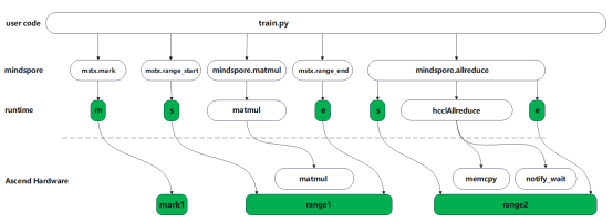 针对大集群场景传统Profiler流程重、数据量大的问题,昇思MindSpore2.5版本提供轻量化Profiler能力,帮助大集群场景轻量化获取模型关键指标性能数据。如下图所示,用户可通过mstx.mark、mstx.range_start、mstx.range_end接口自定义打点,同时支持通信算子的内置打点,用户开启轻量化打点功能,通讯算子前后将自动实现打点。所有的打点任务由runtime下发至device侧,可呈现打点任务在host侧和device侧的时间点或时间片。