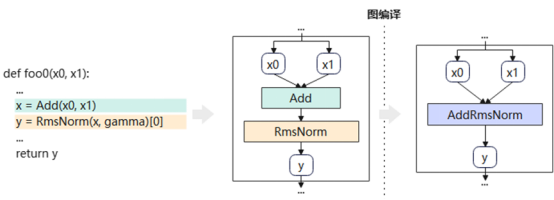 - 算子融合:基于计算图通过自动模式匹配实现算子融合,在整图范围内将多种小算子组合,融合成单个大颗粒的算子。大算子既减少Host下发的开销,同时也大大缩短了Device的计算时延。