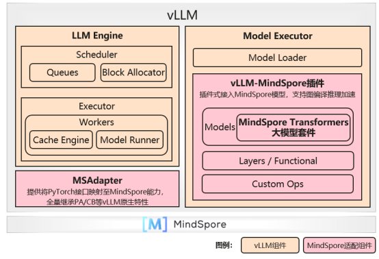 昇思MindSpore2.6版本开发了vllm-mindspore独立插件,将大模型推理能力接入到了vLLM生态中。对于vLLM服务化和调度组件,将PyTorch 接口映射至昇思MindSpore能力调用,全面支持其vLLM Continual Batching、PagedAttention等核心特性。通过将vLLM后端的模型、网络层、自定义算子等组件,替换为昇思孵化、基于前端并行的大模型推理模块,继承昇腾+昇思的高性能推理能力。