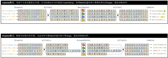 1 全面支持Dropless MoE训练,分层通信+前反向通信掩盖加速DeepSeek V3大集群部署