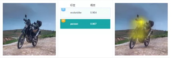 这个例子中,有个错误预测标签“person”,根据显著图可视化结果,高亮区域在摩托车的前部,便于针对性的分析误判的可能原因。