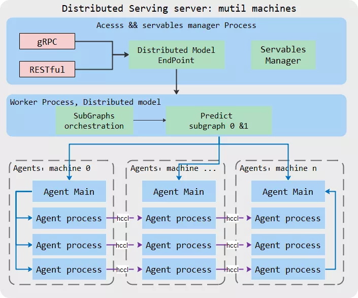 MindSpore Serving支持分布式模型的在线推理部署,根据模型并行策略切分为多个小图,每个卡部署两个图的各一个小图。下图中,每个卡通过一个Agent进程管理图加载和执行,卡之间通过HCCL进行高速通信,分布式主worker进程和各个Agent进程之间通过gRPC通信,用于请求数据的发送和请求结果的接受。