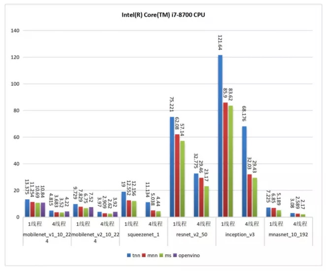 为了更好的支持PC侧推理,x86_64从汇编层面入手,支持针对不同卷积shape的动态block切分,充分利用寄存器等硬件资源,使我们推理性能达到极致,较上个版本推理时延有了10%~75%+的提升。我们在Intel Core i7-8700 CPU上与OpenVINO(2021.3.394)、MNN(1.2.0)、TNN(v0.3)在几个经典CV类网络上进行benchmark测试,从测试结果可以看出MindSpore Lite保持了较高的水平。