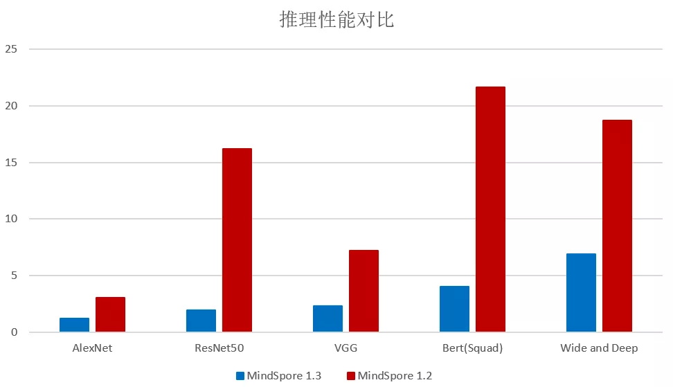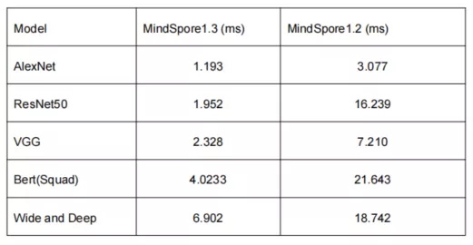 基于Model Zoo中的一些典型的网络,分别使用MindSpore1.2和MindSpore1.3版本对,统计推理请求平均执行时间,推理性能提升3~8倍。
