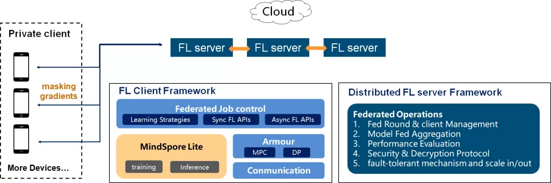 端云场景下的参与方是非常大量的手机或者IoT设备,其分布规模和设备不可靠性带来了系统异构、通信效率、隐私安全和标签缺失等挑战。MindSpore Federated设计了松耦合分布式服务器、限时通信模块、容忍退出的安全聚合等模块,使得任何时候只要部分客户端可用,都可以进行联邦学习任务,并解决了系统异构带来的“长尾效应”,提高了学习效率。