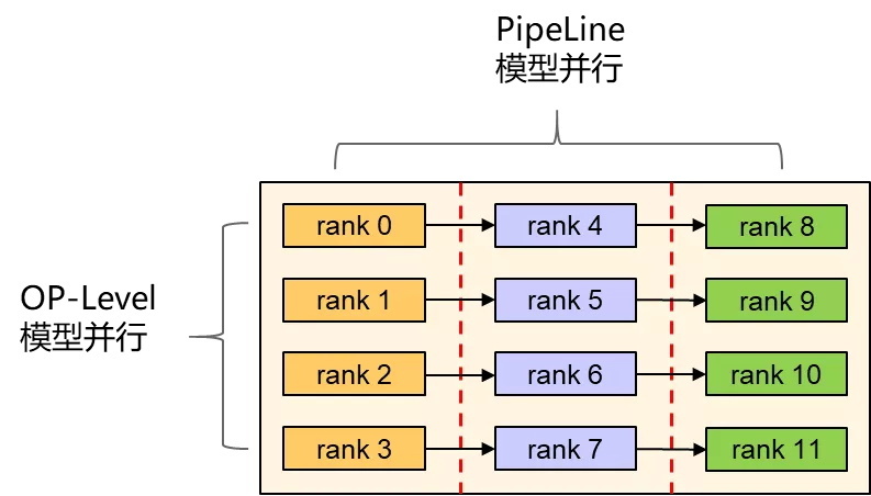 当大模型推理参数量较大难以部署到一张卡上时,MindSpore可通过OP-Level和PipeLine模型并行将大模型切分到多卡。我们实现了鹏程.盘古2000亿级参数量的模型部署。