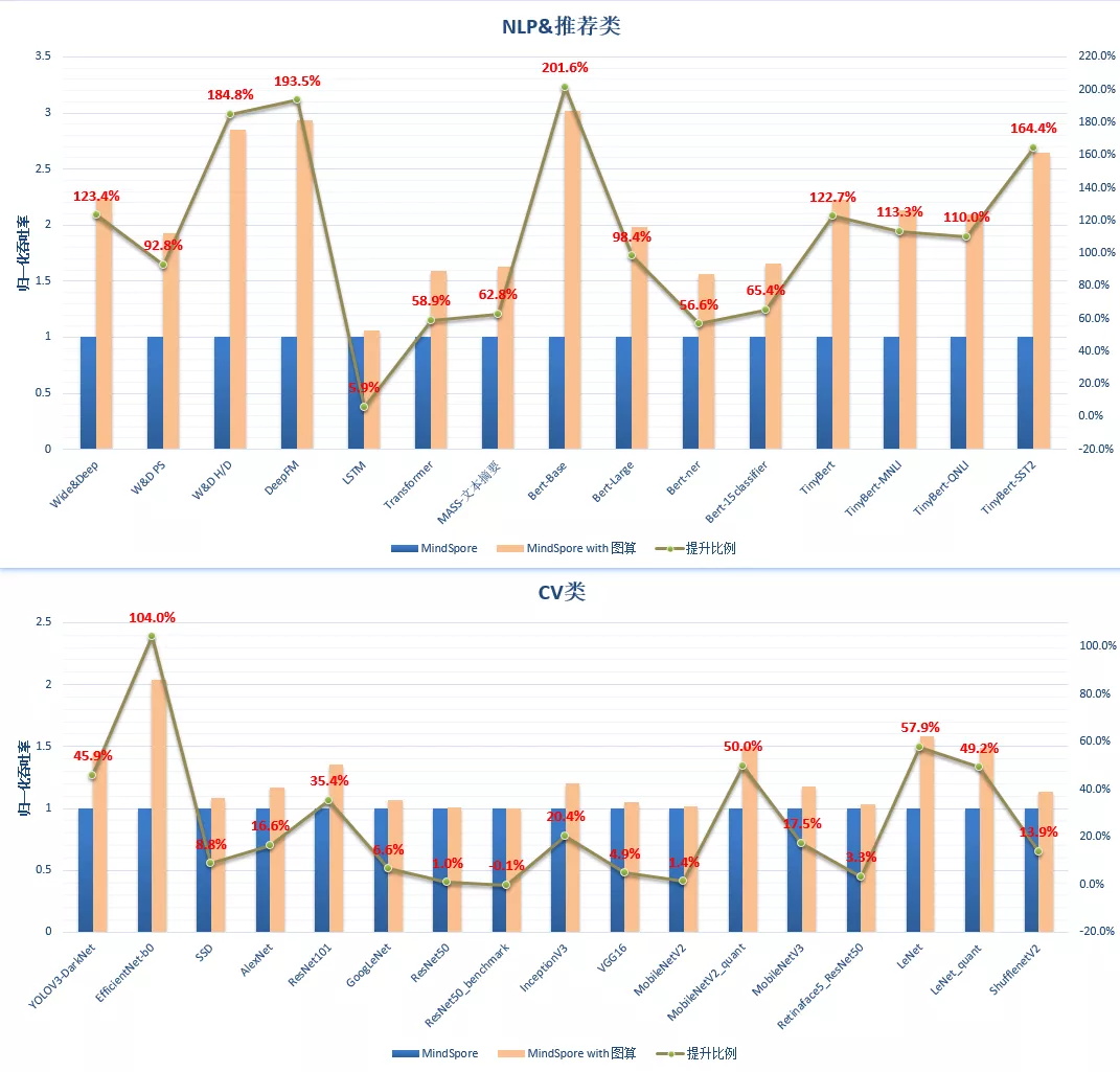 我们选取了部分主流的网络(NLP、推荐及CV)开展性能对比评测,使用图算融合的有普遍的性能提升,提升详情如下图所示: