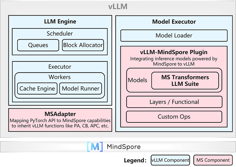 vLLM, an open source and community-driven project initiated by Sky Computing Lab, UC Berkeley, has been widely used in academic research and industry applications. On the basis of Continuous Batching scheduling mechanism and PagedAttention Key-Value cache management, vLLM provides a rich set of inference service features, including speculative inference, Prefix Caching, Multi-LoRA, etc. vLLM also supports a wide range of open-source large models, including Transformer-based models (e.g., LLaMa), Mixture-of-Expert models (e.g., DeepSeek), Embedding models (e.g., E5-Mistral), and multi-modal models (e.g., LLaVA). Because vLLM chooses to use PyTorch to build large models and manage storage resources, it cannot deploy large models built upon MindSpore.